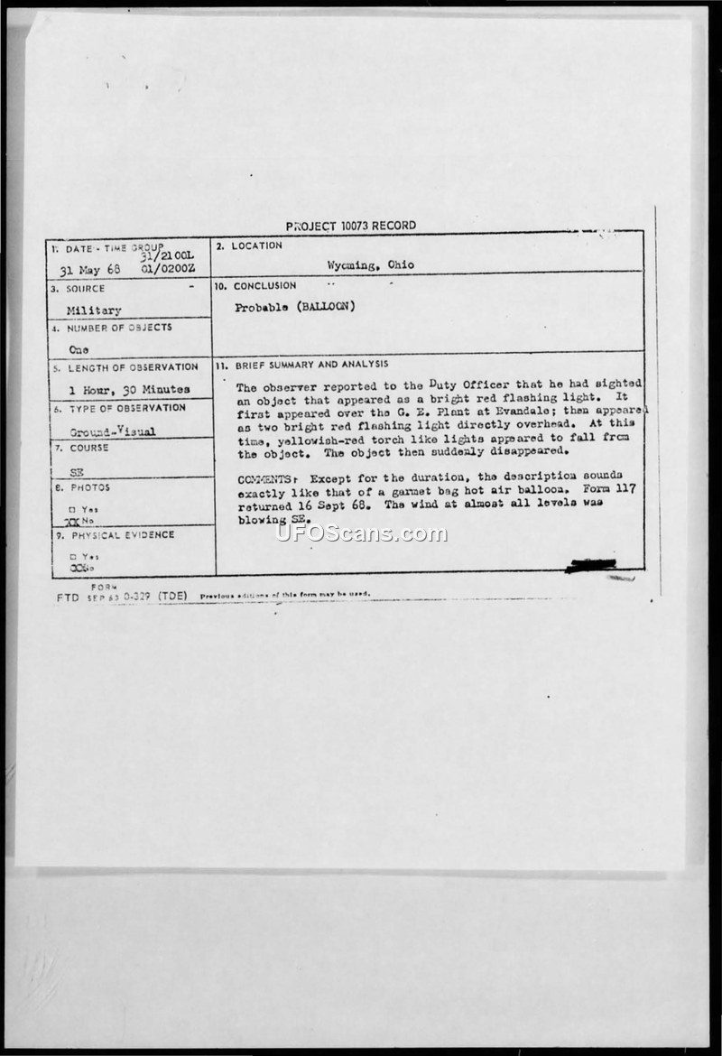 Project 10073 Record — Wyoming, Ohio, 31 May 1968