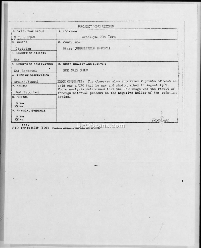 Project 10073 Record: UFO Sightings of Aug 1967 and 8 Jun 1968