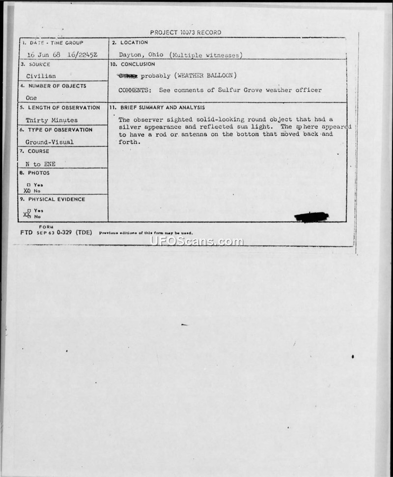 Project 10073 Record — Dayton, Ohio, 16 June 1968