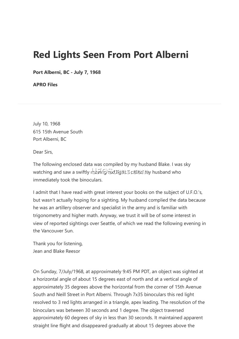 This document is a correspondence dated July 10, 1968, from Jean and Blake Reesor of Port Alberni, British Columbia, to APRO regarding a UFO sighting. The sighting occurred on the evening of July 7, 1968, at approximately 9:45 PM PDT. Jean Reesor first observed a swiftly moving red light while sky watching, prompting her husband, Blake Reesor—a former army artillery observer with a background in trigonometry and higher mathematics—to observe the object through 7x35 binoculars. Through the binoculars, the light resolved into three red lights arranged in a triangle with the apex leading. The object moved in a straight line, traversing approximately 60 degrees of the sky in under 30 seconds. The observers noted that the sky was clear and the stars were bright, yet there was no audible jet noise or significant background noise. Blake Reesor provided a technical analysis of the event, estimating the object's velocity to be between 3,000 and 6,000 miles per hour, based on the assumption that the lights represented multiple objects at a considerable distance. The report was submitted to APRO in the context of other reported sightings over Seattle that had been covered in the Vancouver Sun.
