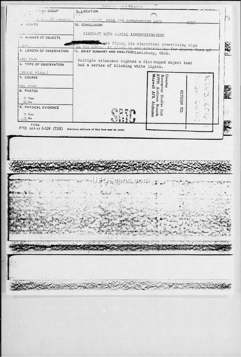 Multiple UFO sightings in Dayton, Ohio, on 22 June 1968 were investigated by the Air Force. The phenomena were officially identified as a Cessna 172 aircraft towing an electrical advertising sign for Stueve Ford.