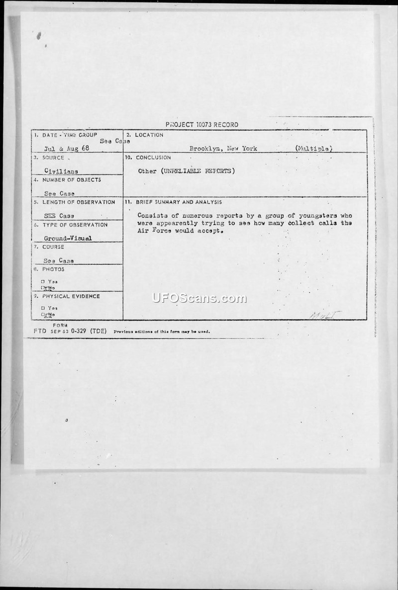 Project 10073 Record: Multiple UFO Sightings in Brooklyn, New York (July-August 1968)