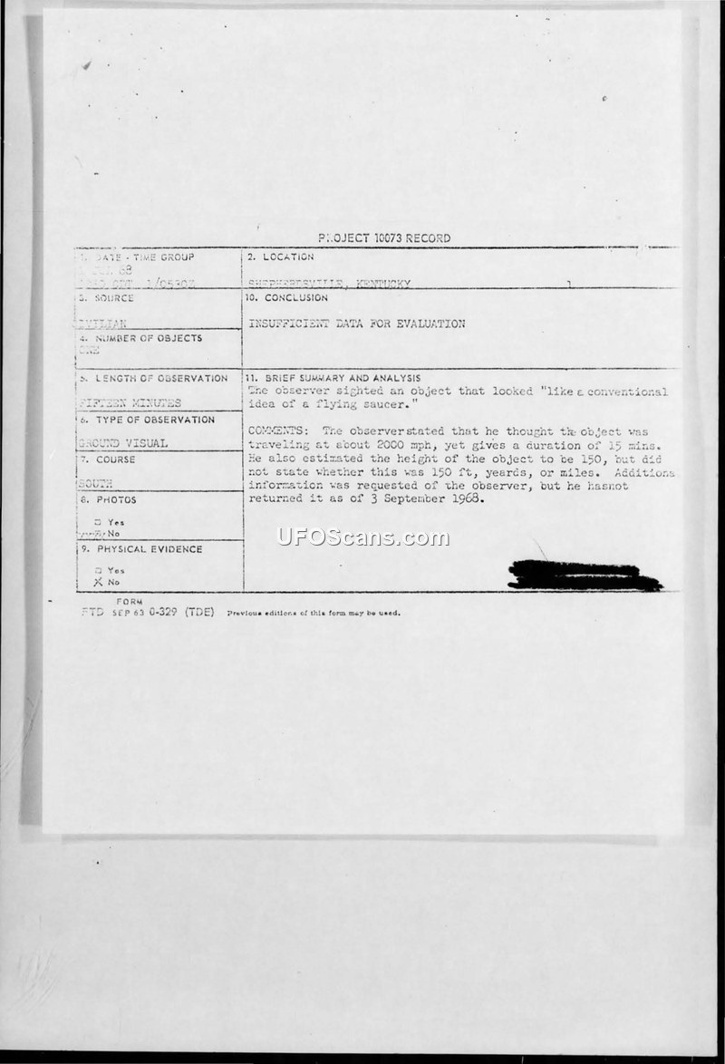 A 1968 UFO sighting report from Shepherdsville, Kentucky, was filed under Project Blue Book. The case was closed as 'insufficient data' because the witness failed to provide requested clarifications regarding distance and time.