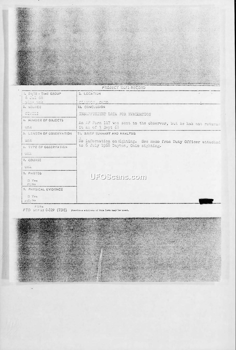A 1968 UFO sighting report in Clayton, Ohio, was closed due to insufficient data after the witness failed to return the required AF Form 117. The file includes internal commentary regarding the administrative burden of processing such reports.