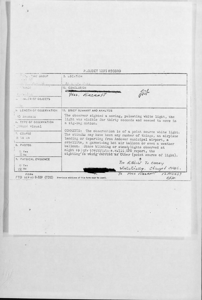 Project 10073 Record — Sighting Report, Andover, Massachusetts, July 8, 1968