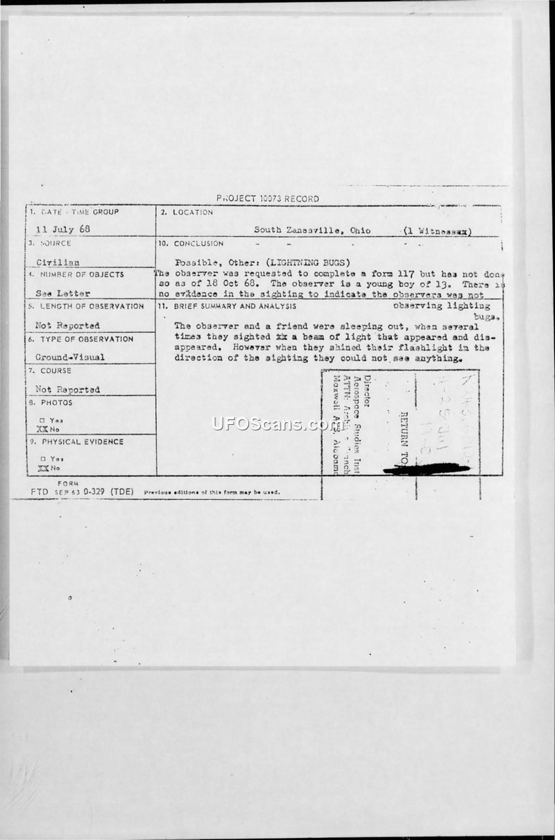 Project 10073 Record — South Zanesville, Ohio, 11 July 1968