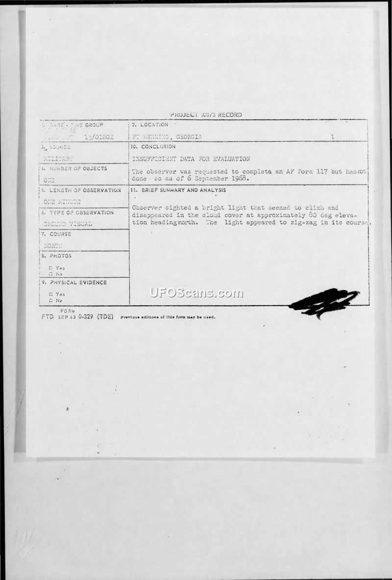Project 100/3 Record: UFO Observation, 12 July 1968, Ft. Benning, Georgia