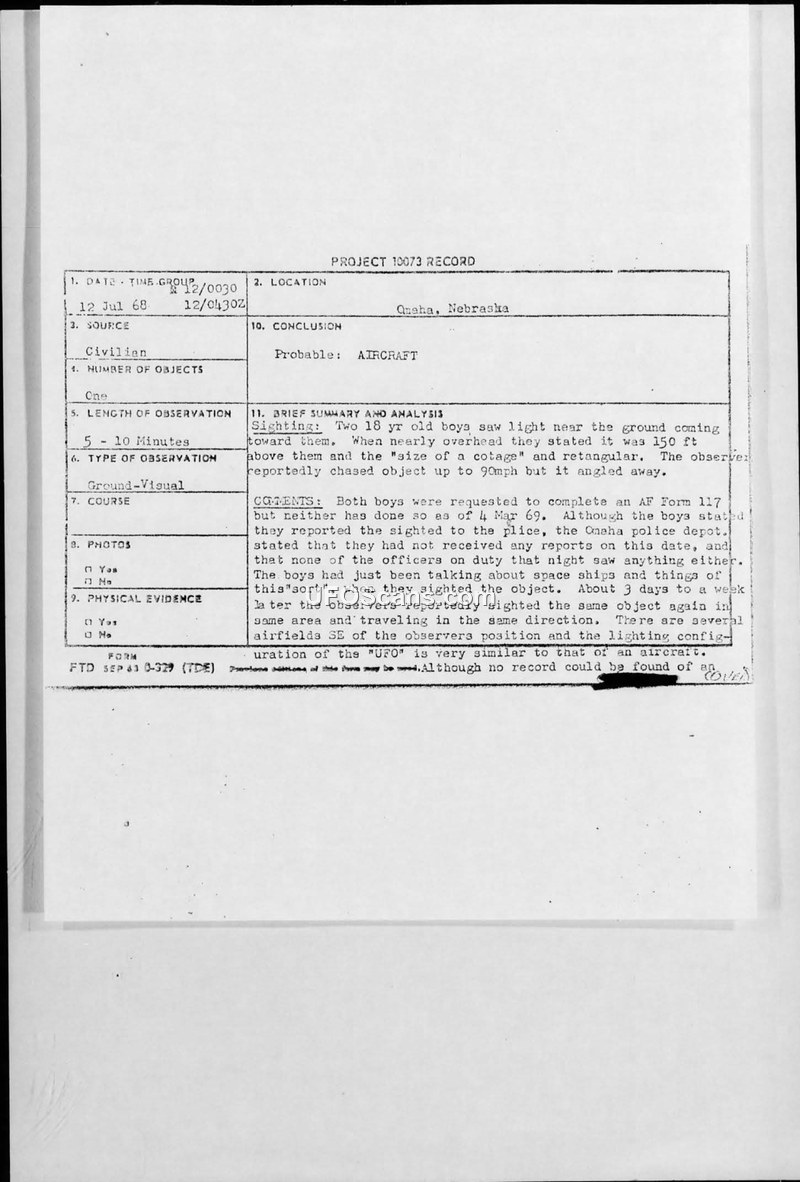 Project 10073 Record: UFO Sighting, 12 July 1968, Omaha, Nebraska