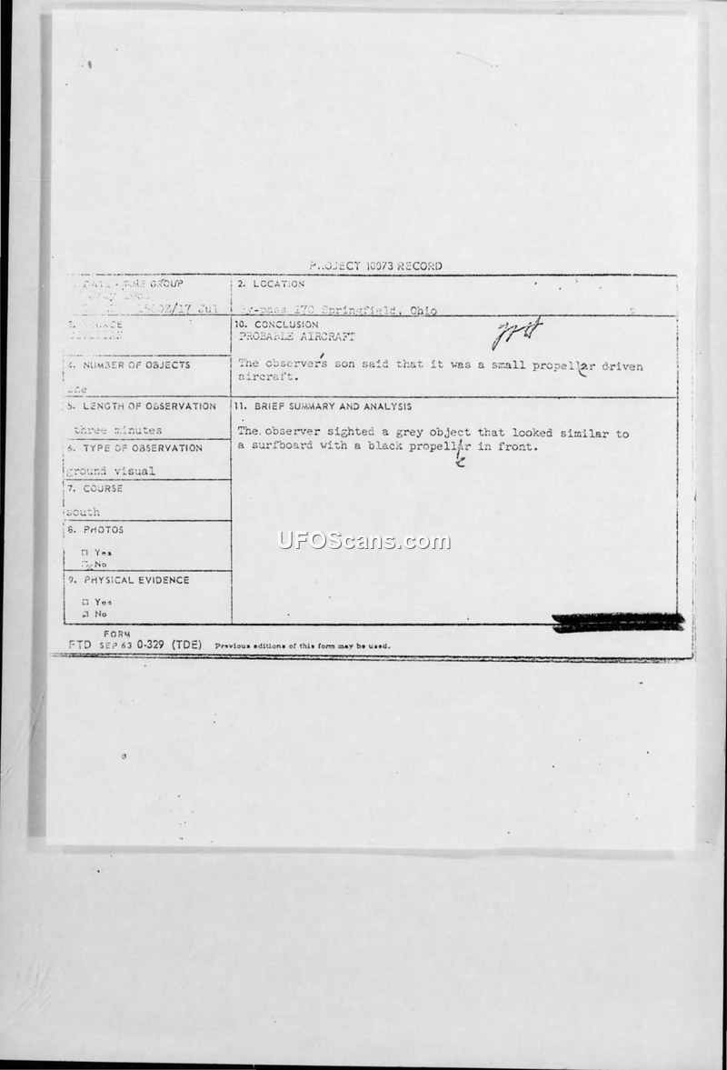 On 17 July 1968, an unidentified aerial object was sighted by a witness near the By-Pass Interstate 70 in Springfield, Ohio. The witness, who was traveling in a car with another passenger, reported seeing a flat, grey object approximately the size of a station wagon. The object was described as having a propeller in front and flying at an altitude of roughly 100 feet. The sighting lasted for approximately two minutes, during which time the witness noted that the object made no noise. The witness reported the incident to the Aerial Phenomena Office at Wright-Patterson Air Force Base. Lt. Col. Hector Quintanilla, Jr., Chief of the Aerial Phenomena Office, initially sent a letter requesting that the witness complete an AF Form 117, as the initial report was deemed insufficient for scientific investigation. The witness subsequently completed the questionnaire, providing a detailed description and a sketch of the object. In her final assessment on the questionnaire, the witness explicitly stated, 'I do not consider the sighting a phenomenon. It was just a small propeller driven craft.' The official Air Force conclusion for the incident was 'PROBABLE AIRCRAFT.'