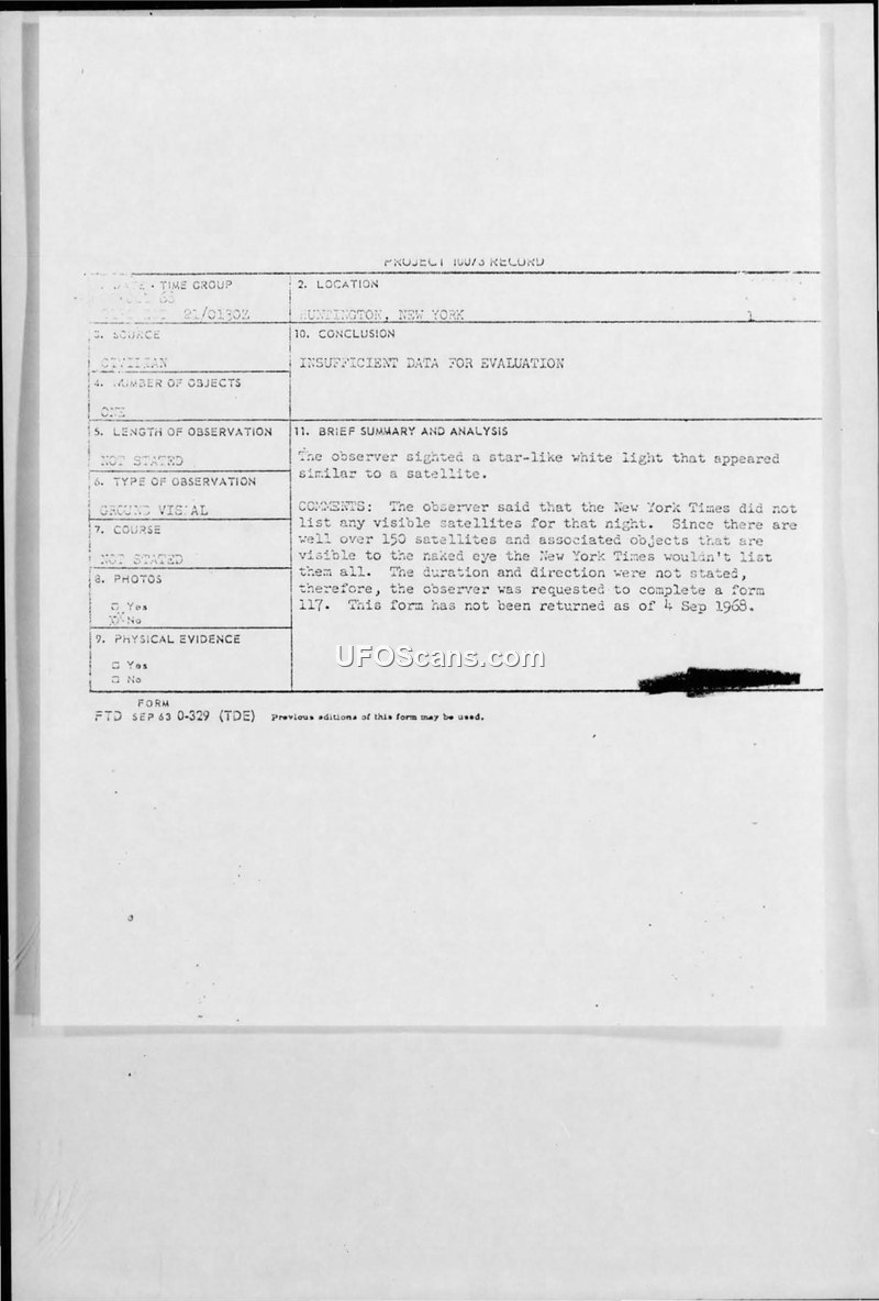 This document contains a record of a UFO sighting reported by a civilian in Huntington, New York, on July 20, 1968. The witness described observing a very small, star-like white light that did not blink and eventually faded away, similar to an airplane. The witness explicitly noted that the object was not a comet, meteor, or asteroid, and that they had checked the New York Times for satellite listings for that night without success. The witness further noted that the Times usually listed satellite locations in the middle of the sky or near the horizons. Following the report, Major James H. Aikman of the USAF Office of Information responded to the witness on August 1, 1968. Major Aikman informed the witness that the report had been referred to his office and that, due to a lack of additional information, an explanation could not be provided. The witness was encouraged to complete an attached questionnaire to facilitate further investigation by technical personnel at Wright-Patterson Air Force Base. The official record for the incident, filed under Project 10073, categorized the case as having 'insufficient data for evaluation.' As of September 4, 1968, the requested questionnaire had not been returned by the witness.