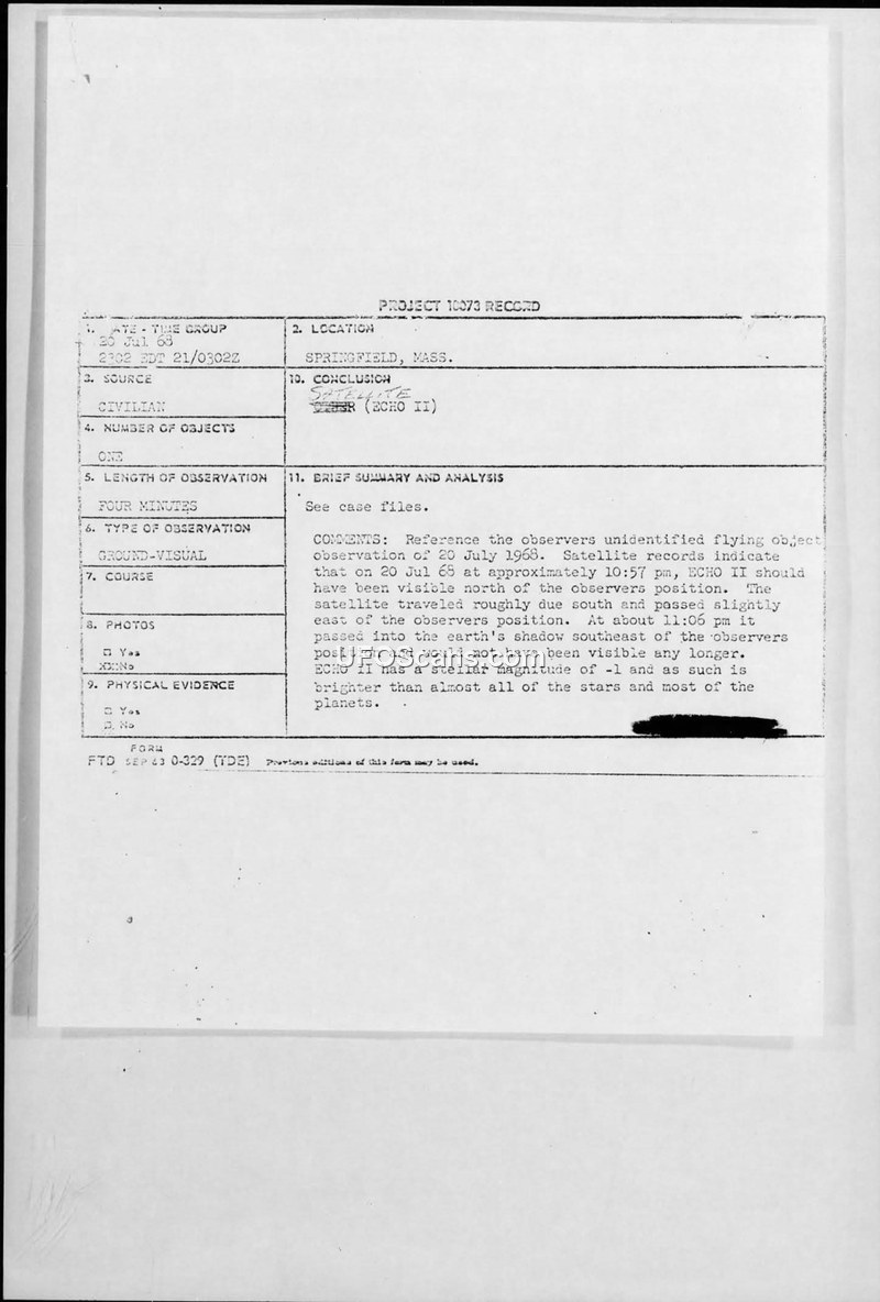 Project Blue Book Sighting Report — Springfield, Massachusetts, 20 July 1968