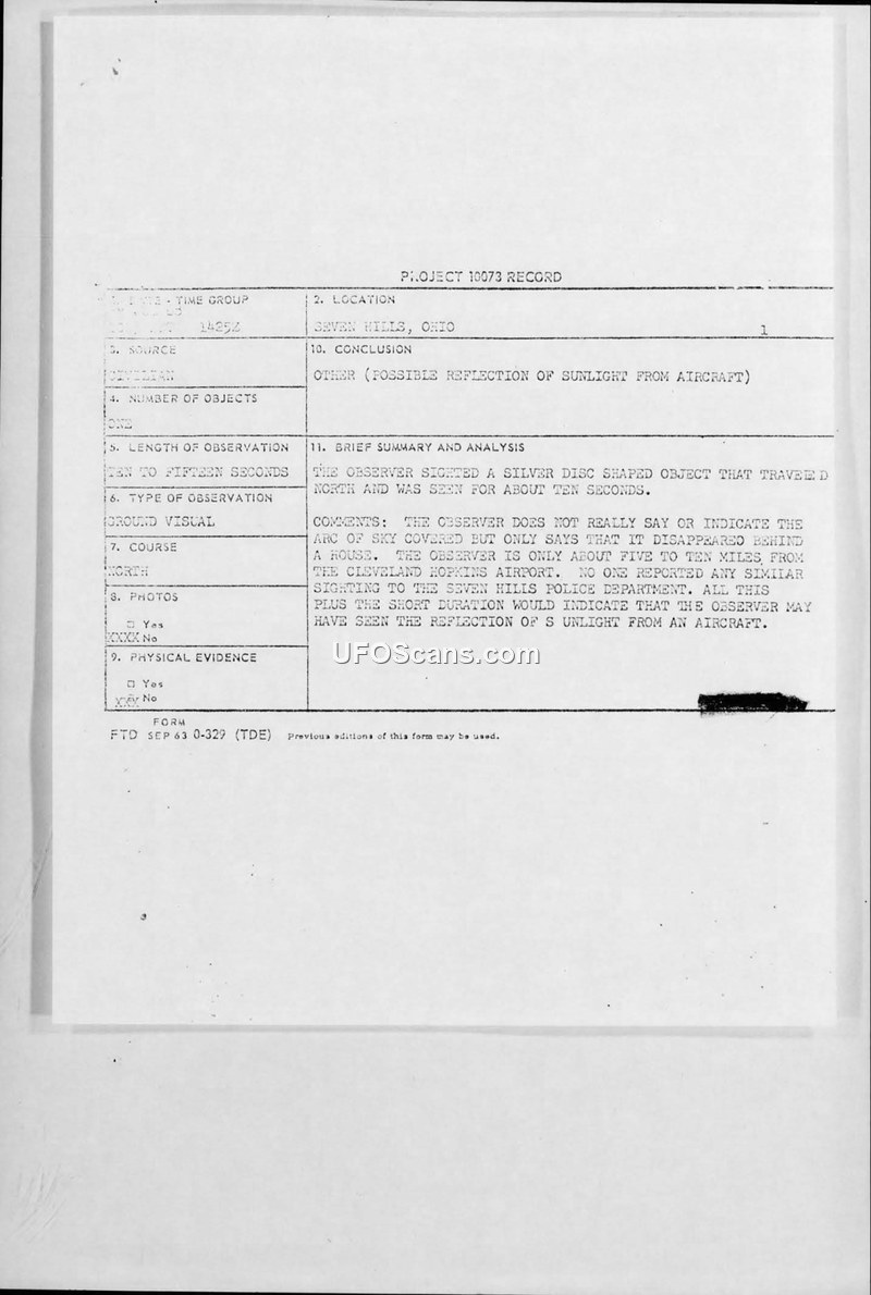 The observer sighted a silver disc-shaped object that traveled north for about ten seconds. The observer was five to ten miles from Cleveland Hopkins Airport. The Air Force concluded the object was likely a reflection of sunlight from an aircraft.