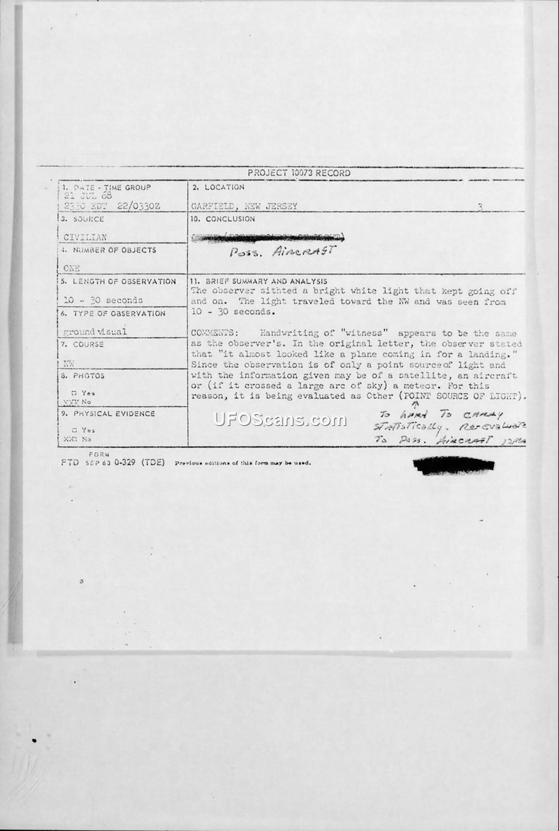 Project 10073 Record — Sighting in Garfield, New Jersey, 21 July 1968