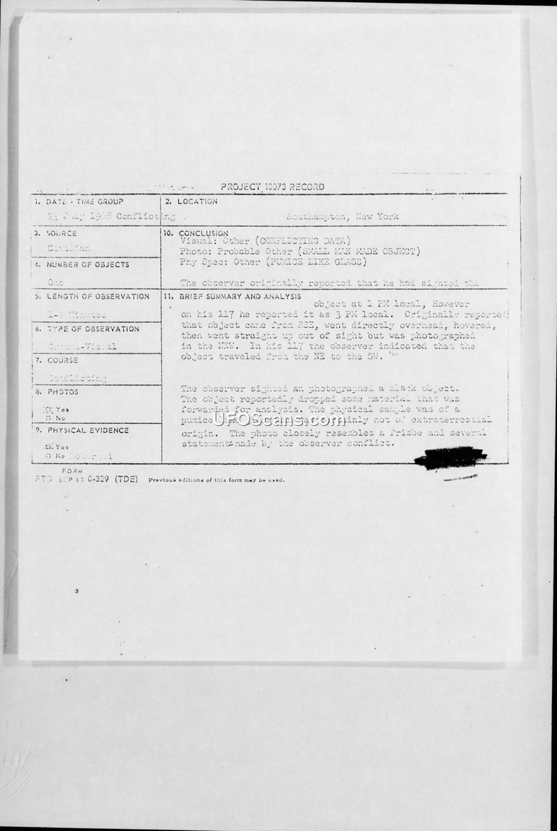 A civilian reported a UFO sighting in Southampton, New York, and provided a physical sample. Analysis by Northwestern University identified the sample as industrial sanding material, leading the Air Force to conclude the object was not extraterrestrial.