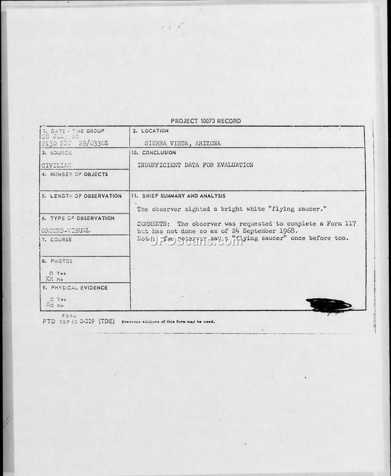 Project 10073 Record: Sighting Report - Sierra Vista, Arizona, 28 July 1968