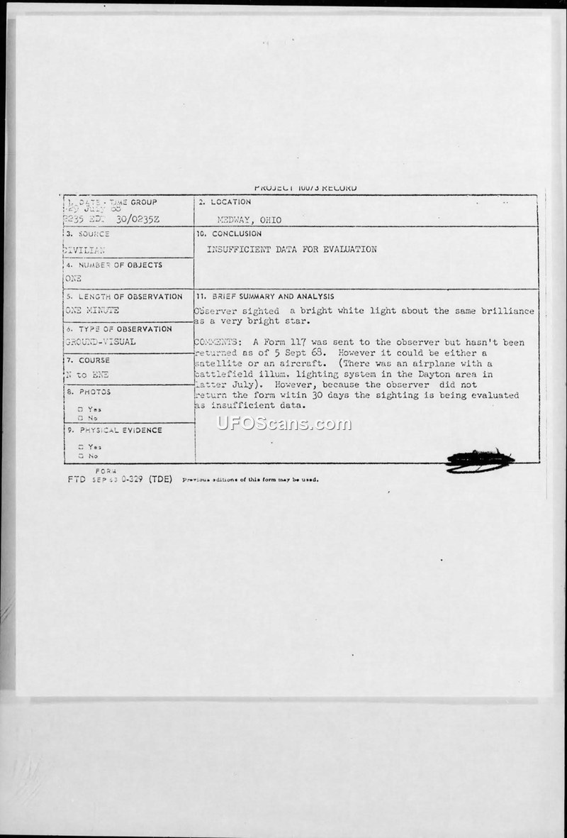 The observer reported a bright white light. The Air Force sent a Form 117, but it was not returned within 30 days. The report notes that the object could have been a satellite, an aircraft, or related to a battlefield illumination lighting system test in the Dayton area.