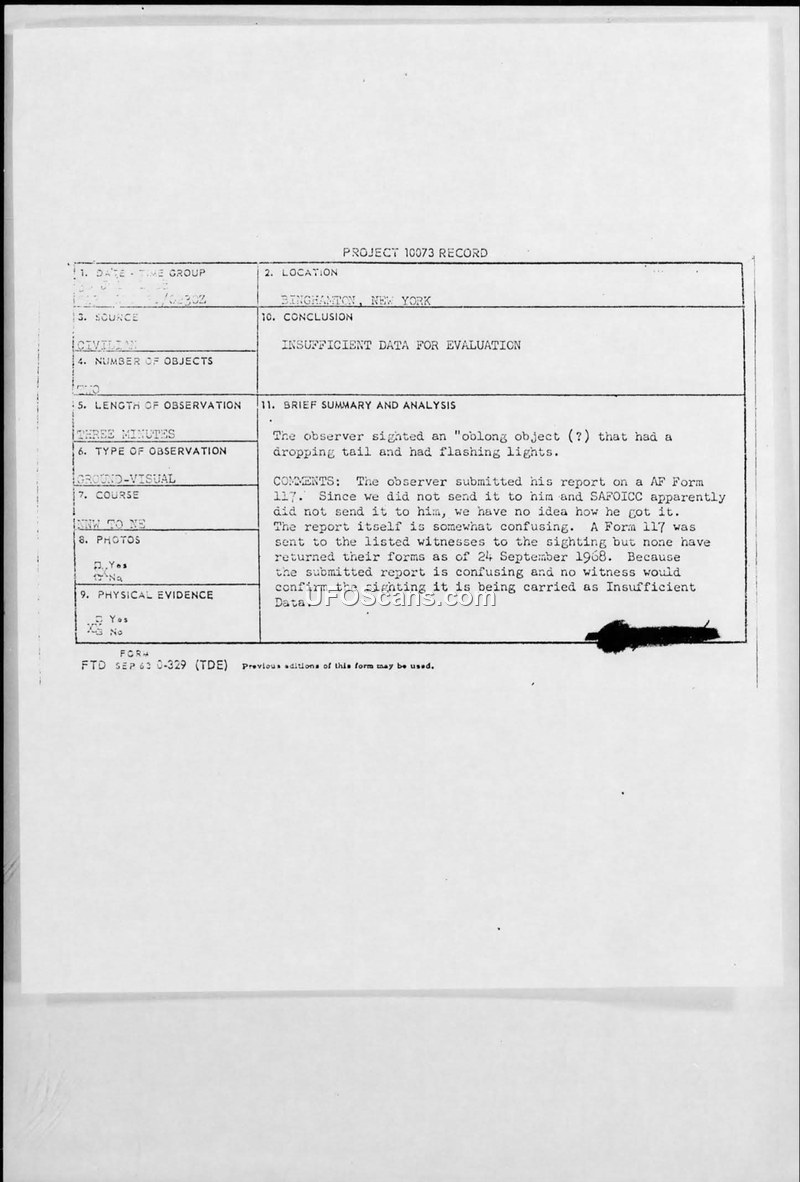 Project 10073 Record — Binghamton, New York, 30 July 1968