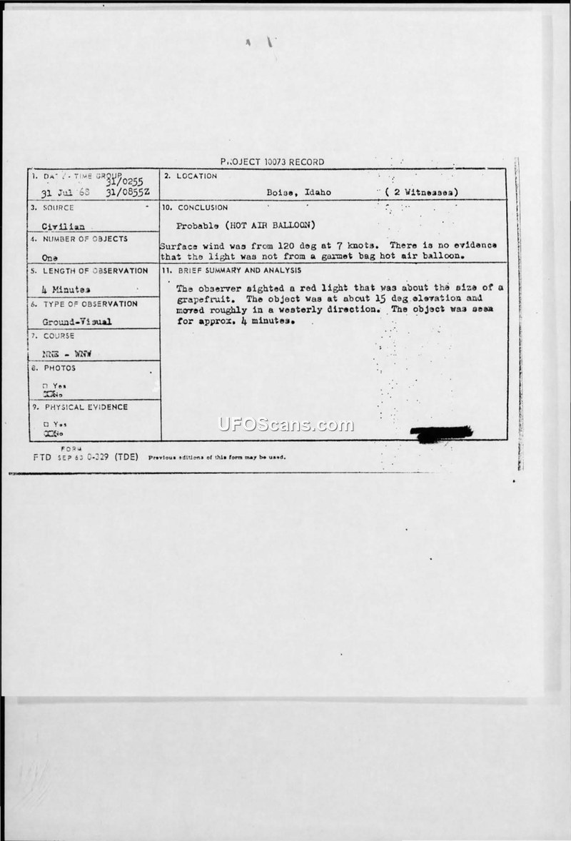 Project 10073 Record — UFO Observation, 31 July 1968, Boise, Idaho