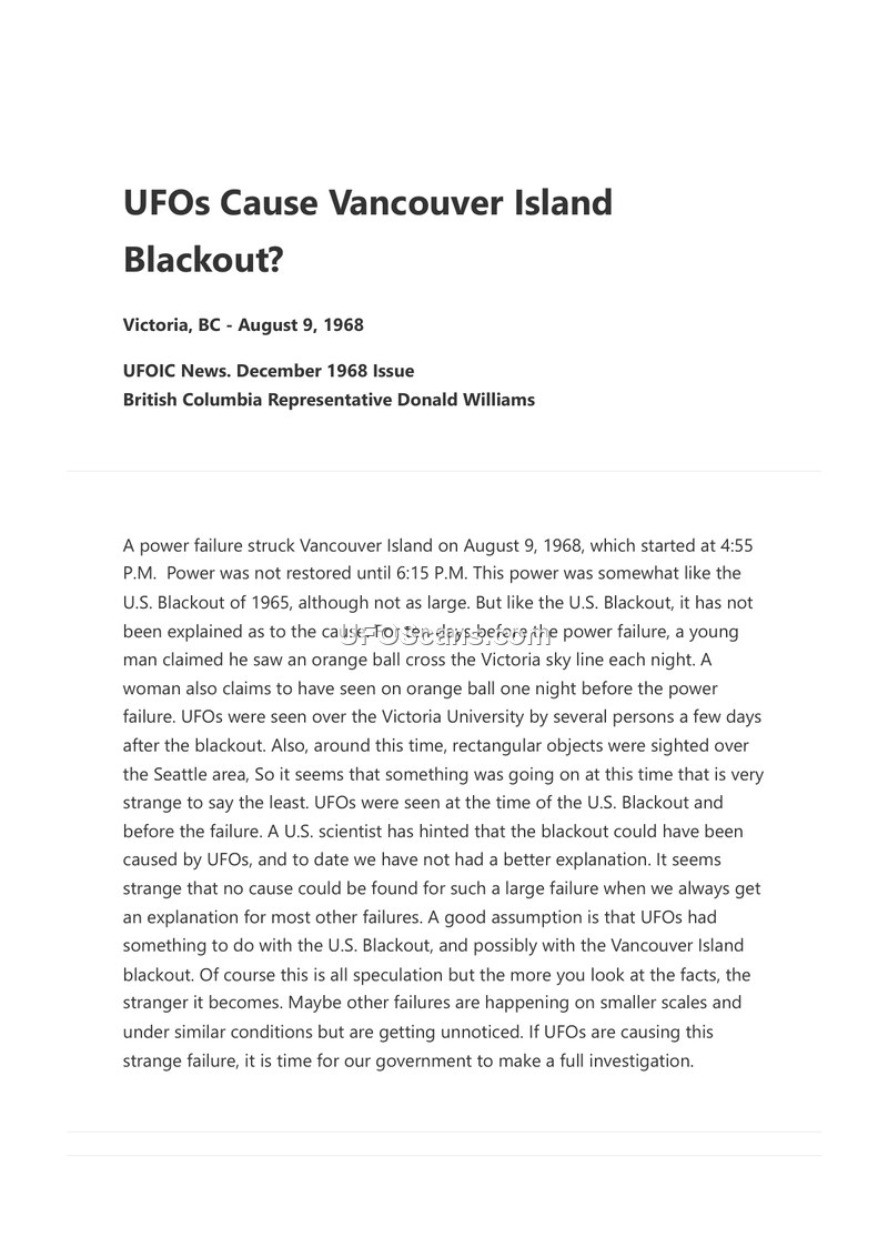 This document, published in the December 1968 issue of UFOIC News by British Columbia Representative Donald Williams, examines a power failure that occurred on Vancouver Island on August 9, 1968. The blackout began at 4:55 P.M. and lasted until 6:15 P.M. Williams compares this event to the 1965 U.S. Blackout, noting that both incidents lacked clear explanations. The report highlights several anecdotal sightings in the region, including a young man who reported seeing an orange ball in the sky nightly for ten days prior to the failure, and a woman who reported a similar sighting the night before. Additionally, sightings of UFOs were reported over Victoria University shortly after the blackout, and rectangular objects were reportedly sighted over the Seattle area around the same time. Williams notes that a U.S. scientist had previously hinted at a connection between UFOs and the 1965 U.S. Blackout. The author argues that given the lack of a conventional explanation for the Vancouver Island failure, it is reasonable to speculate that UFOs may have been involved. The document concludes by suggesting that such failures might be occurring on smaller scales without notice and advocates for a full government investigation into the phenomenon.