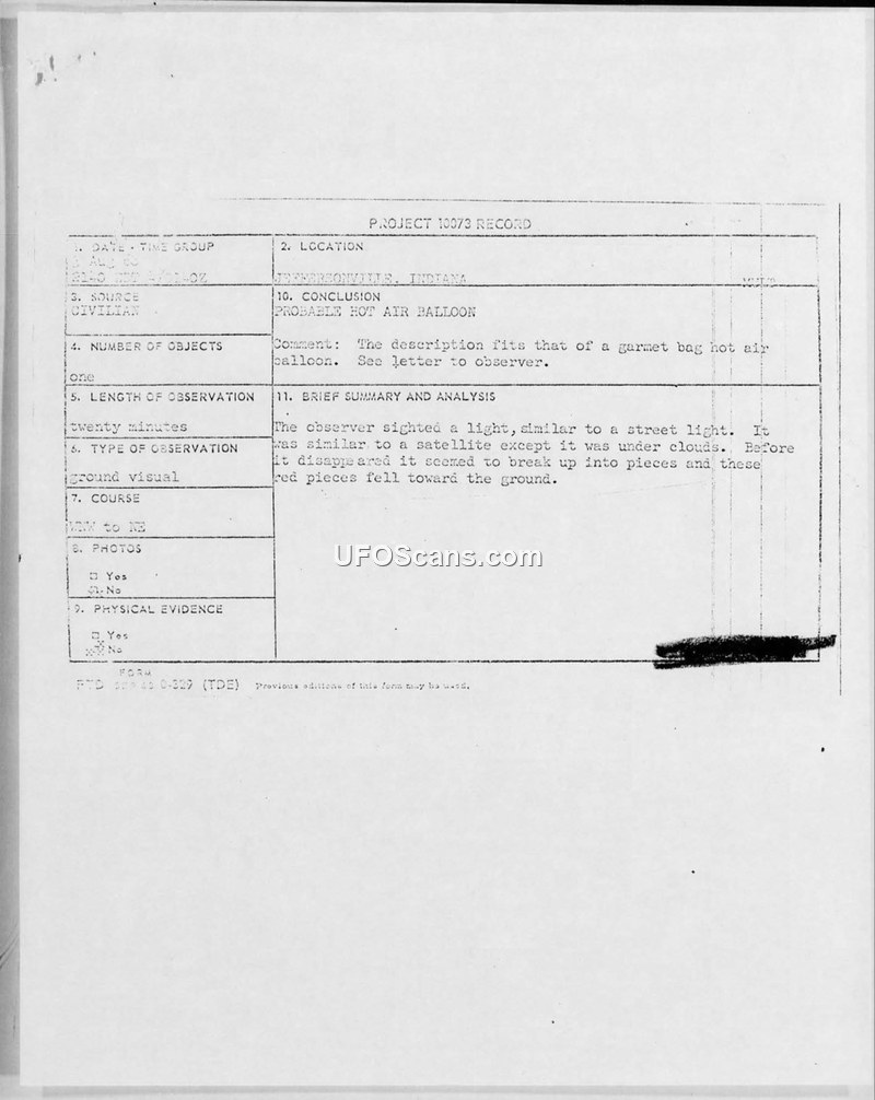 A civilian in Jeffersonville, Indiana, reported a bright, ball-shaped light that disintegrated in the sky on August 3, 1968. The Air Force concluded the object was a plastic hot air balloon.