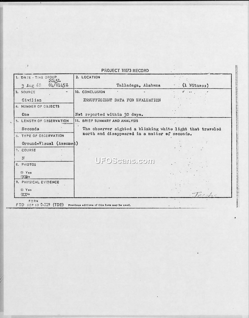 A civilian report of a blinking white light observed in Talladega, Alabama, on August 3, 1968. The official project conclusion was that there was insufficient data for evaluation.