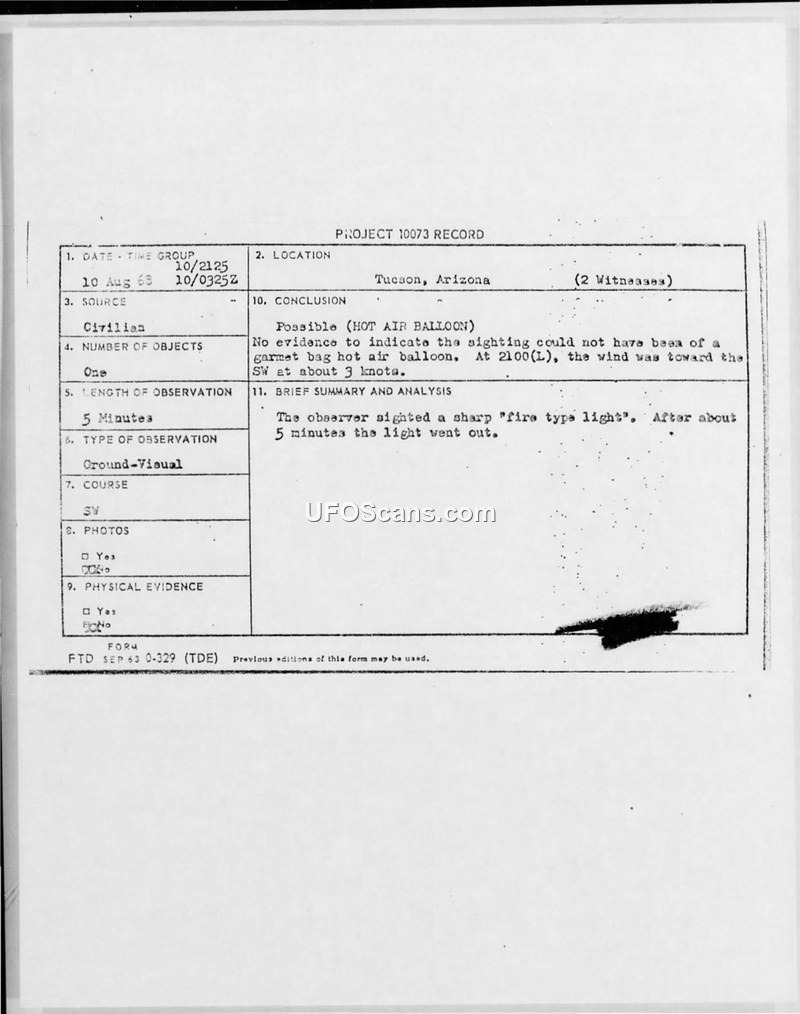 Project 10073 Record — Tucson, Arizona, 10 August 1968
