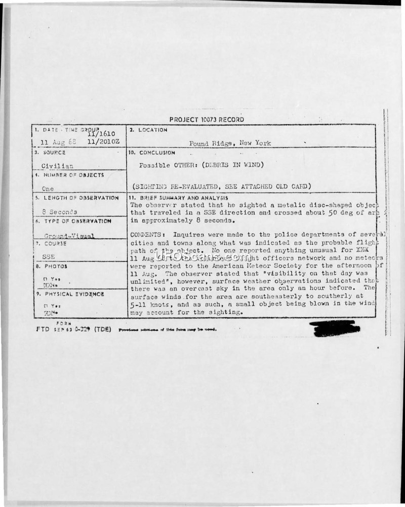 Project 10073 Record — Pound Ridge, New York, 11 August 1968