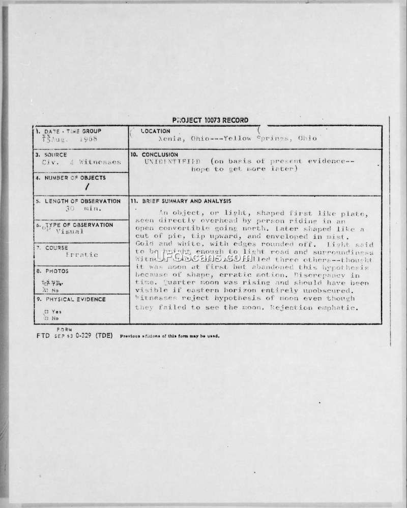 This document collection details the investigation of a UFO sighting that occurred on 15 August 1968 in Yellow Springs, Ohio. The primary witnesses, a family including a student of aerospace engineering, reported seeing a bright, spinning object that they initially thought was the moon but later rejected due to its erratic movement, color, and a reported 'groaning' noise and 'funny odor.' Dr. J. Allen Hynek, acting as an investigator for the Air Force's Project Blue Book, conducted interviews with the witnesses. His initial assessment left the case as 'unidentified,' which drew sharp criticism from Dr. Donald H. Menzel of the Harvard College Observatory. Menzel, a frequent consultant for the Air Force, argued that the object was almost certainly the moon, and that the witnesses' reports were influenced by autokinesis—a psychological phenomenon where a stationary light appears to move—and their own preconceived beliefs in flying saucers. Menzel was highly critical of Hynek's methodology, particularly the decision to interview all witnesses simultaneously, which he believed led to them answering for one another and reinforcing erroneous conclusions. Menzel repeatedly urged the Air Force to close the case and remove it from the list of 'unknowns,' suggesting that the witnesses were unreliable and that the Air Force should have been more rigorous in its questioning, such as verifying the witnesses' eyesight or their potential membership in saucer-related organizations. The correspondence between Menzel and Lt. Col. Hector Quintanilla, Jr. of the Foreign Technology Division highlights a significant internal debate within the Air Force's UFO investigation efforts, with Menzel advocating for a skeptical, 'Menzelian' approach that favored natural explanations over the more open-ended investigative style employed by Hynek.