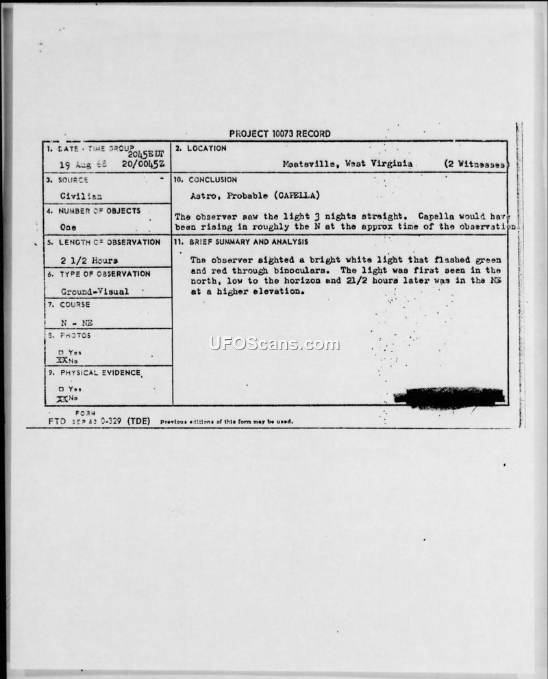 This document is a Project 10073 record concerning a UFO sighting reported in Moatsville, West Virginia, on August 19, 1968. The report includes correspondence from the Department of the Air Force, specifically the Foreign Technology Division and the Aerial Phenomena Office, addressed to a witness in Moatsville. The Air Force requested that the witness complete an AF Form 117 to provide sufficient information for a scientific investigation, noting that initial reports were inadequate. The witness, a civilian, reported observing a single, self-luminous, globe-shaped object for approximately two and a half hours. The object was described as a bright white light that flashed green and red when viewed through binoculars. The witness observed the object moving from the north, low on the horizon, to the northeast at a higher elevation. The sighting occurred under clear weather conditions. The official conclusion reached by the Aerial Phenomena Office was that the object was likely the star Capella, noting that the star would have been rising in the north at the approximate time of the observation, and that the observer reported seeing the light for three consecutive nights.