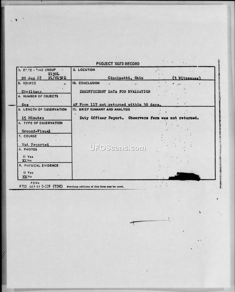 Project 10073 Record — Cincinnati, Ohio, 20 August 1968
