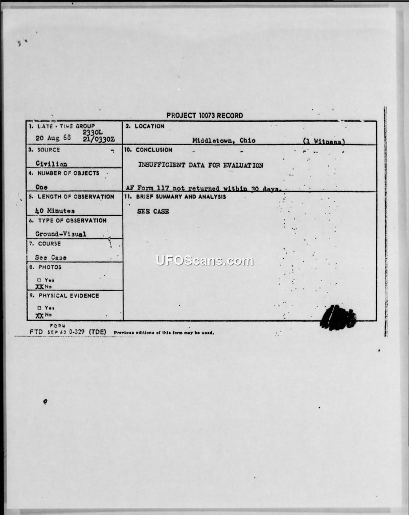 Project 10073 Record — Middletown, Ohio, 20 August 1968