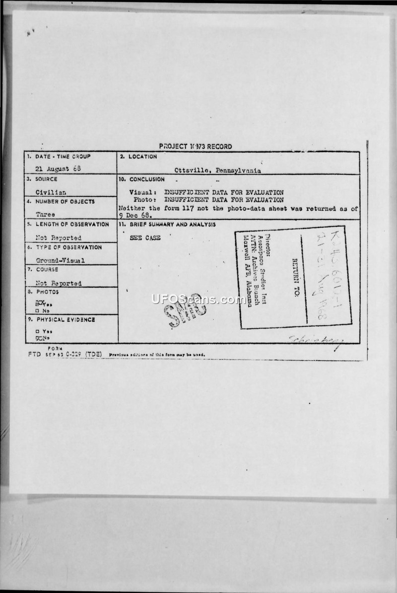 Project 10973 Record — Ottsville, Pennsylvania, 21 August 1968