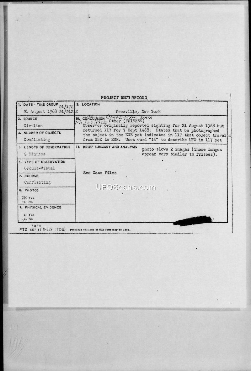 Project 10073 Record — Sighting in Freeville, New York, 21 August 1968