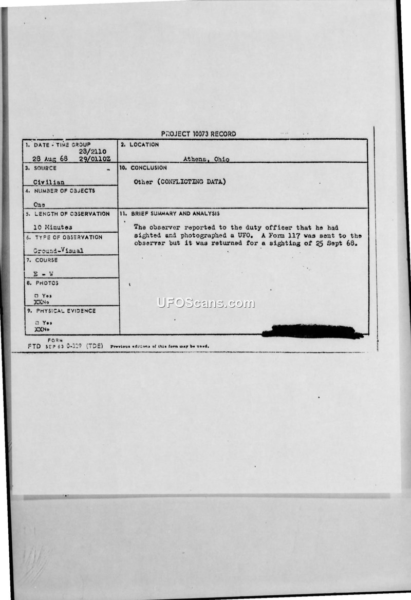A student in Athens, Ohio, reported observing three disc-shaped UFOs on August 28, 1968, and claimed to have taken photographs. The Air Force investigation was hampered by administrative confusion regarding the sighting date, resulting in a conclusion of conflicting data.
