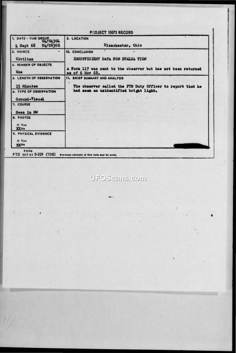 Project 10073 Record — Blanchester, Ohio, 4 September 1968