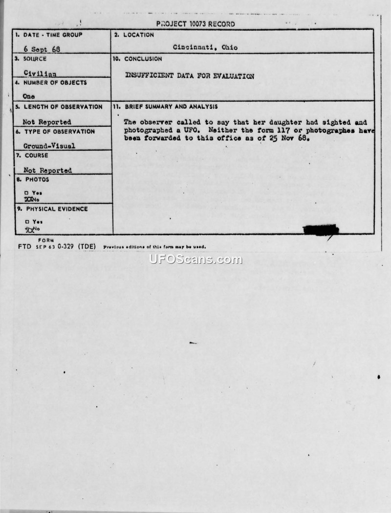 Project 10073 Records — Cincinnati, Ohio Sightings (September 1968)