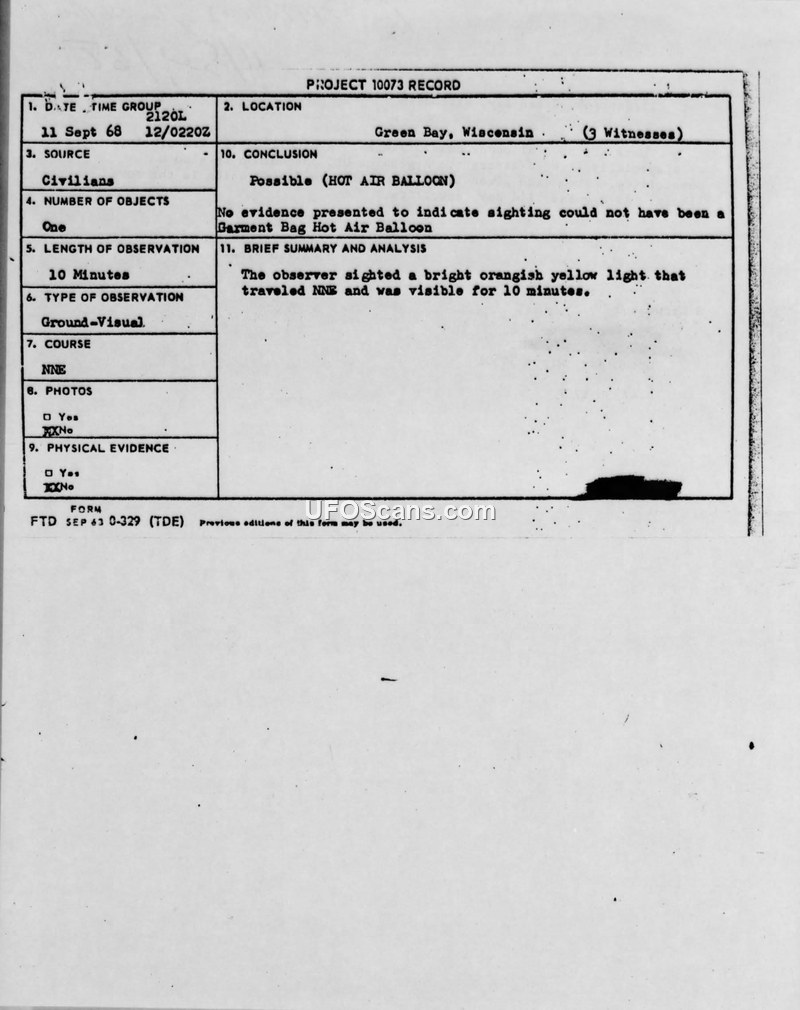Project 10073 Record — Sighting in Green Bay, Wisconsin, 11 September 1968
