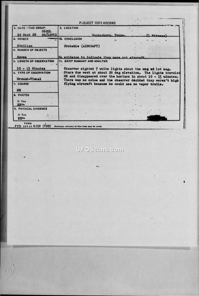 On September 20, 1968, at 0605 local time, a civilian witness in Waynesboro, Pennsylvania, observed seven white lights in the sky. The objects were described as being approximately the magnitude of first-magnitude stars, positioned at an elevation of about 20 degrees in the western sky. Over a duration of 10 to 15 minutes, the lights traveled from the southwest to the northeast before disappearing over the horizon. The witness reported that there was no audible noise and noted the absence of vapor trails, which caused them to question whether the objects were conventional high-flying aircraft. A subsequent memorandum for the record, dated September 24, 1968, noted that the angular velocity of the objects was comparable to that of the Echo I satellite. The witness was identified as an employee of Ft. Detrick. The official conclusion recorded in the Project 10073 file categorized the sighting as a 'Probable (AIRCRAFT)' event, stating there was no evidence to indicate the objects were not aircraft.