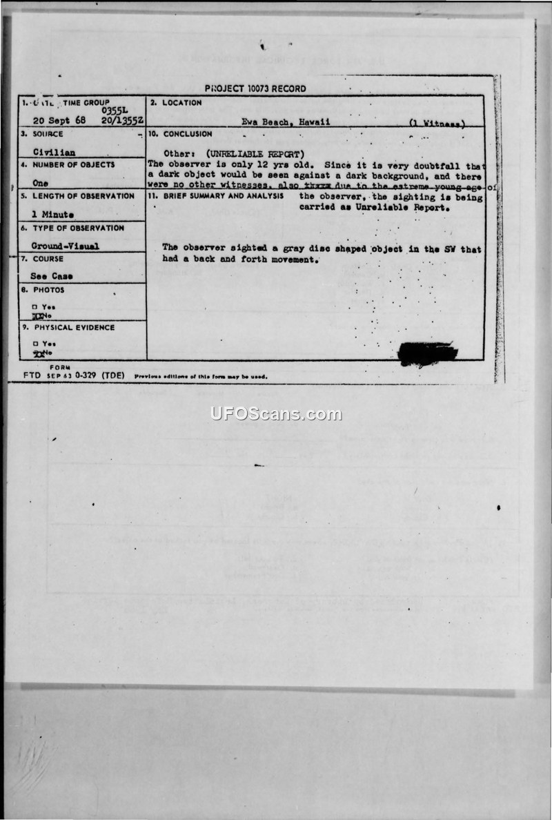 A 12-year-old in Ewa Beach, Hawaii, reported a gray, disc-shaped object on September 20, 1968. The U.S. Air Force classified the report as unreliable due to the witness's age and environmental conditions.