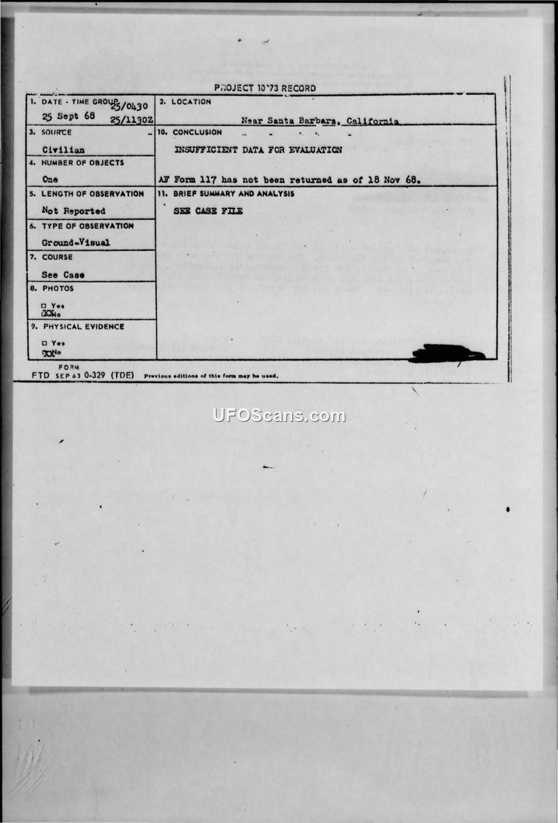 Project 1073 Record — Sighting Near Santa Barbara, California, September 25, 1968