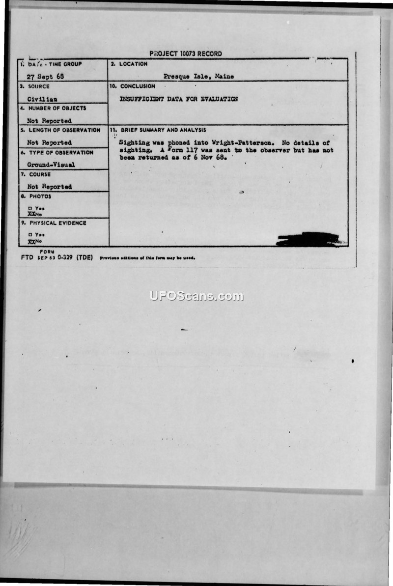 Project 10073 Record — Presque Isle, Maine, 27 Sept 68