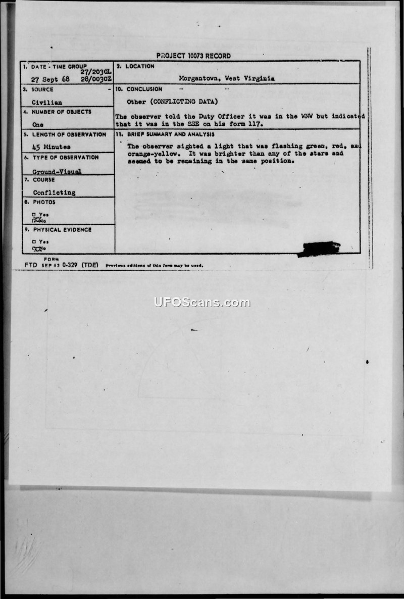 Project 10073 Record — UFO Observation, 27 September 1968, Morgantown, West Virginia