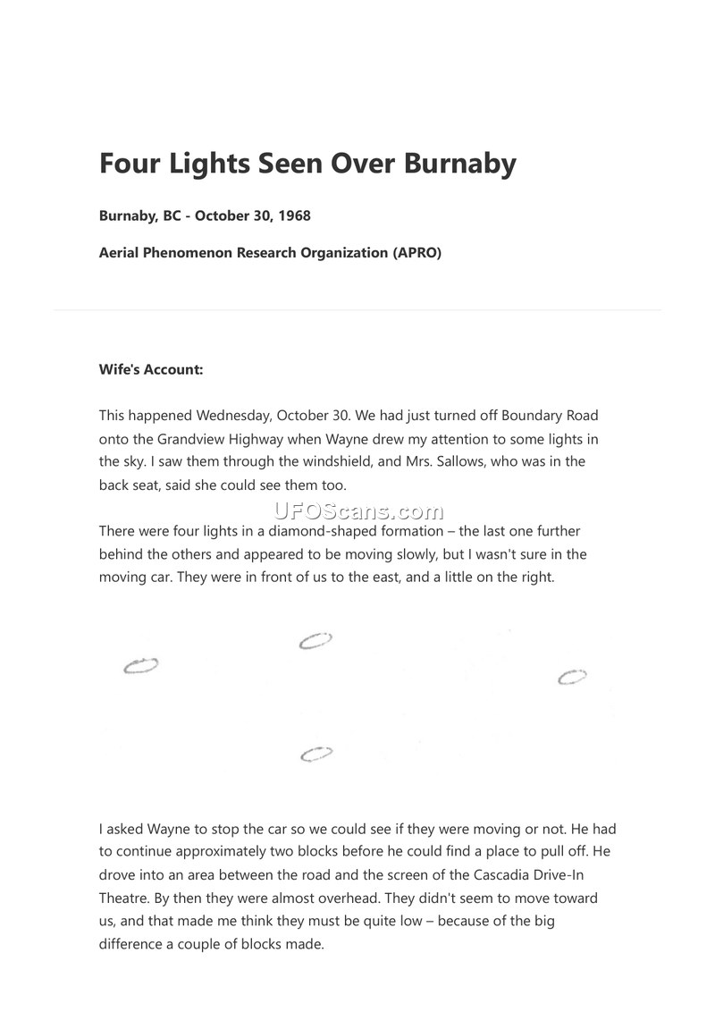 On the evening of October 30, 1968, a couple and a passenger, Mrs. Sallows, were driving on the Grandview Highway in Burnaby, British Columbia, when they observed a series of unidentified lights in the sky. Initially, four lights were spotted in a diamond-shaped formation to the east. The witnesses pulled over near the Cascadia Drive-In Theatre to observe the objects. Over the course of approximately thirty minutes, additional lights appeared, eventually totaling ten. The objects were described as oval or oblong, light yellow with an orange tint, and appeared to be flying at a tilted angle. The witnesses noted that the objects moved in an aimless, wandering fashion, occasionally stopping and hovering. At one point, a larger object arrived, and the smaller lights appeared to encircle it. The larger object emitted two bright flashes, after which all the objects departed rapidly toward the northeast. The witnesses reported that the objects made no sound. The husband estimated the altitude to be just under half a mile. A separate, brief sighting of a single light was noted by the witnesses on November 1, 1968, at approximately 11:45 PM, involving a pale yellow light that dropped a yellow ball of light before disappearing.