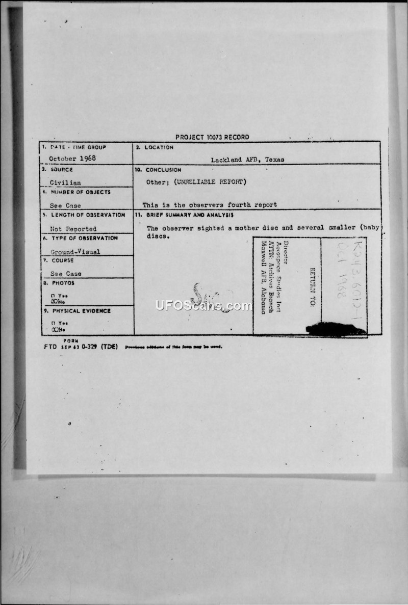A civilian witness reported observing a mother disc and several smaller discs near Lackland AFB in October 1968. The report was submitted to the Air Force's Foreign Technology Division after being redirected from the University of Colorado's closed UFO project office.
