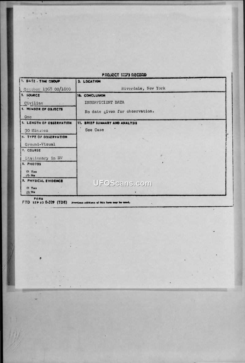 A civilian reported a 90-minute UFO sighting near the George Washington Bridge in October 1968. The Air Force concluded the report contained insufficient data for a scientific investigation.