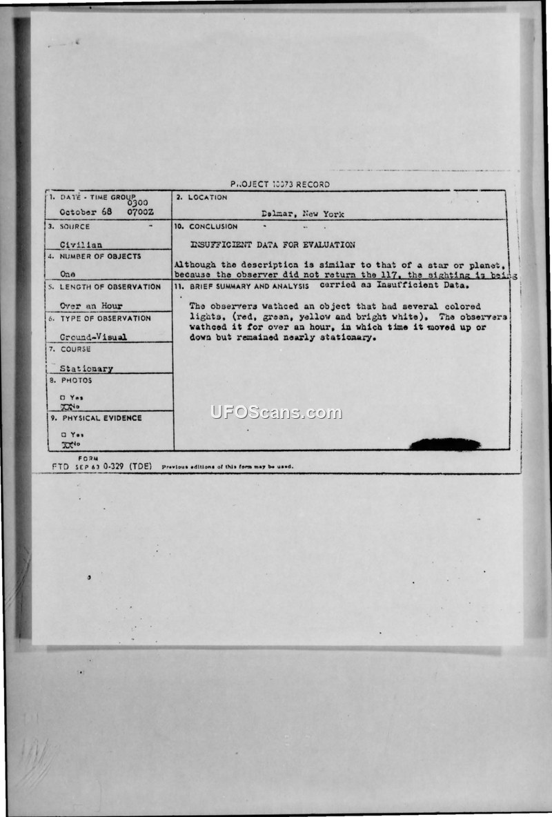 A civilian reported a stationary, multi-colored aerial object in Delmar, New York, in October 1968. The Air Force closed the case as 'Insufficient Data' after the witness failed to return a follow-up questionnaire.