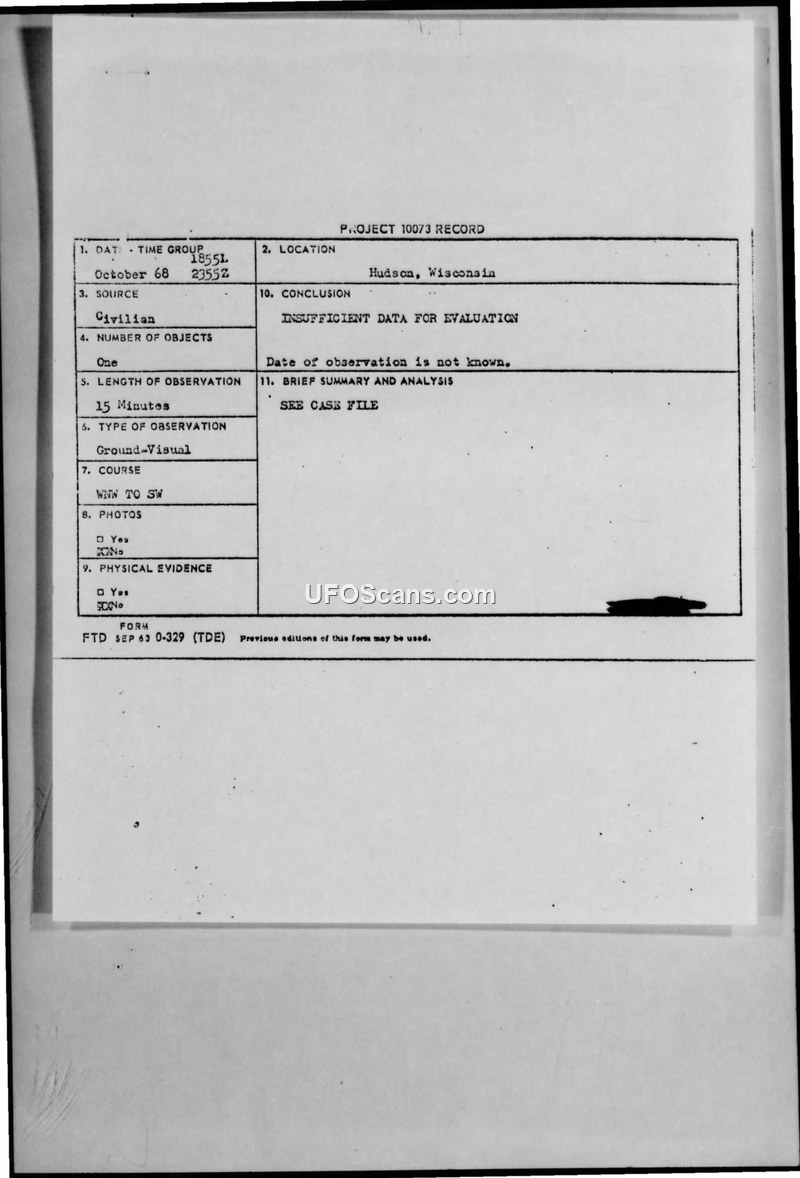 Project 10073 Record — Sighting in Hudson, Wisconsin, October 1968