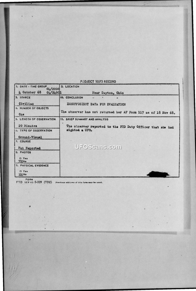 A civilian reported a UFO sighting near Dayton, Ohio, on October 4, 1968. The case was closed as 'insufficient data' because the witness failed to return the required follow-up questionnaire.