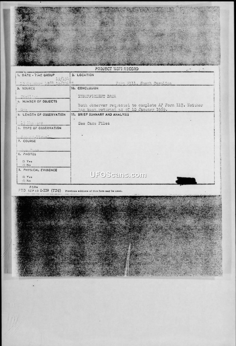 Project 10073 Record — UFO Observation, 19 October 1968, Fort Mill, South Carolina