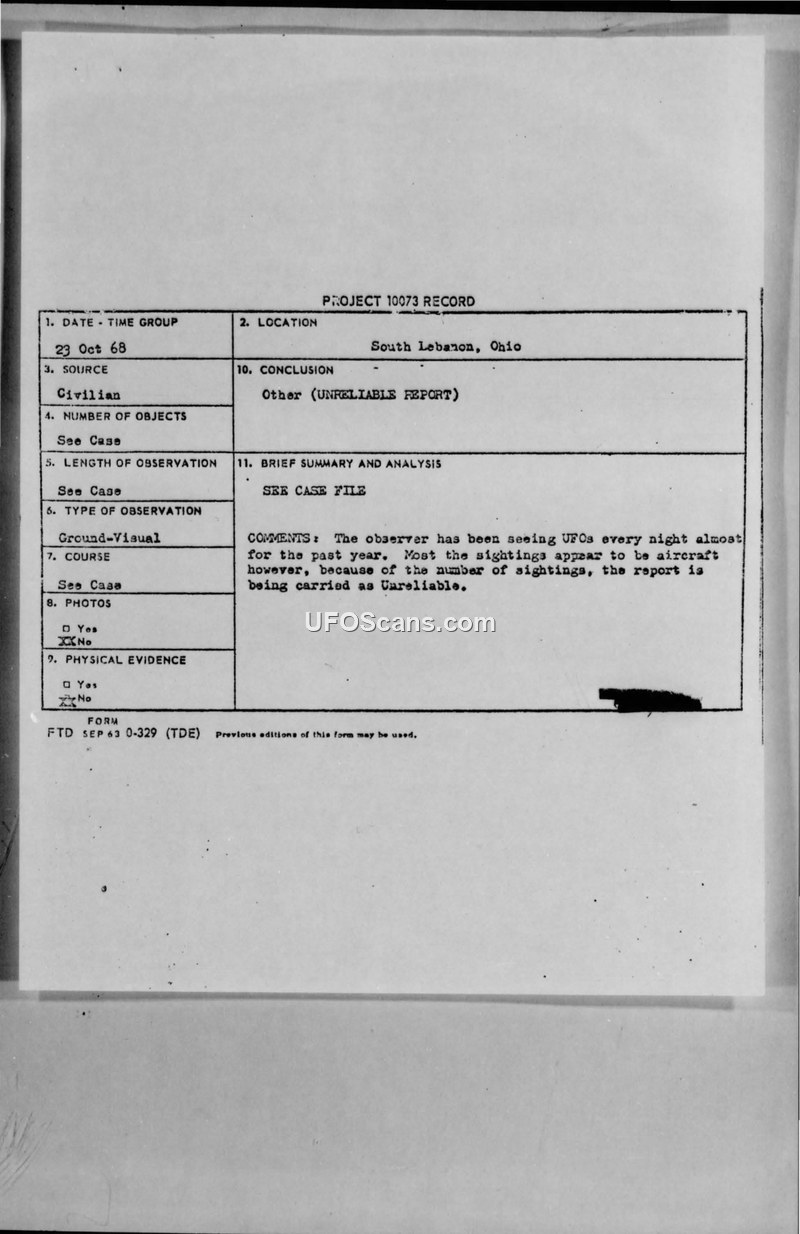 A civilian in South Lebanon, Ohio, reported nightly UFO sightings over a one-year period in 1967-1968. The Air Force classified the report as 'unreliable' because the objects appeared to be aircraft.